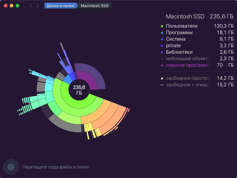 Также рекомендую поставить утилиту визуализации дискового пространства DaisyDisk. Она поможет визуально определить, что именно «съело» объем SSD и быстро устранить этот мусор.