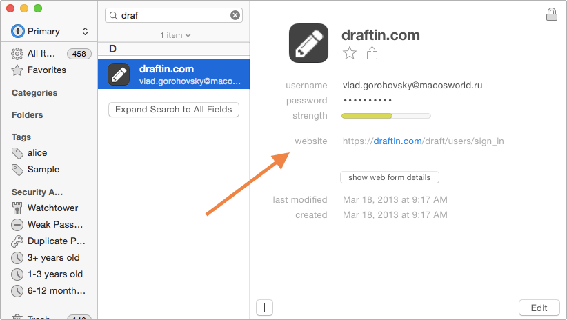 Чтобы добавить «умную» закладку, надо зайти в 1Password, выбрать запись и перетянуть её в панель закладок Safari. Закладкой станет ссылка, находящаяся в поле «website».