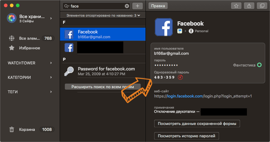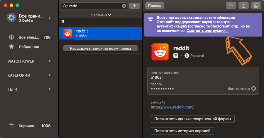 Если на сайте есть возможность использовать двухэтапную авторизацию, то 1Password вам об этом напомнит.