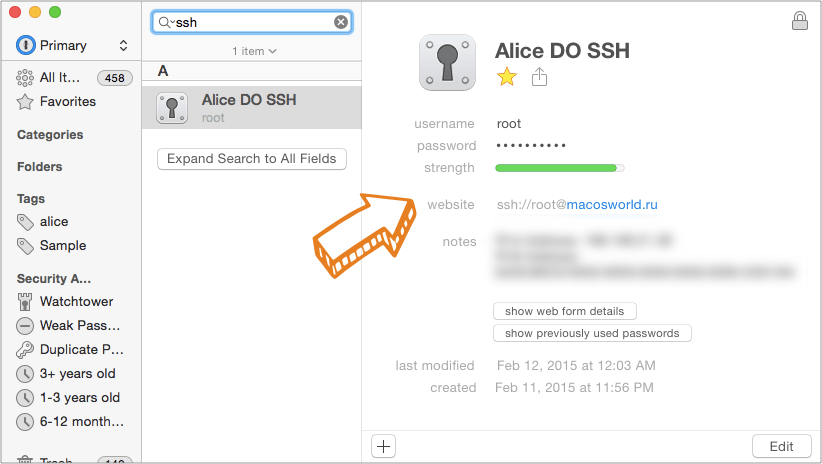 Вместо того, чтобы просто хранить в 1P свой пароль, от SSH можно сделать умную ссылку, которая при клике будет автоматически запускать для вас Terminal и отправлять команду на вход. Вам останется только ввести пароль от SSH. Проще говоря, не нужно отдельно запускать Terminal и вбивать что-то вроде ssh root@google.com.