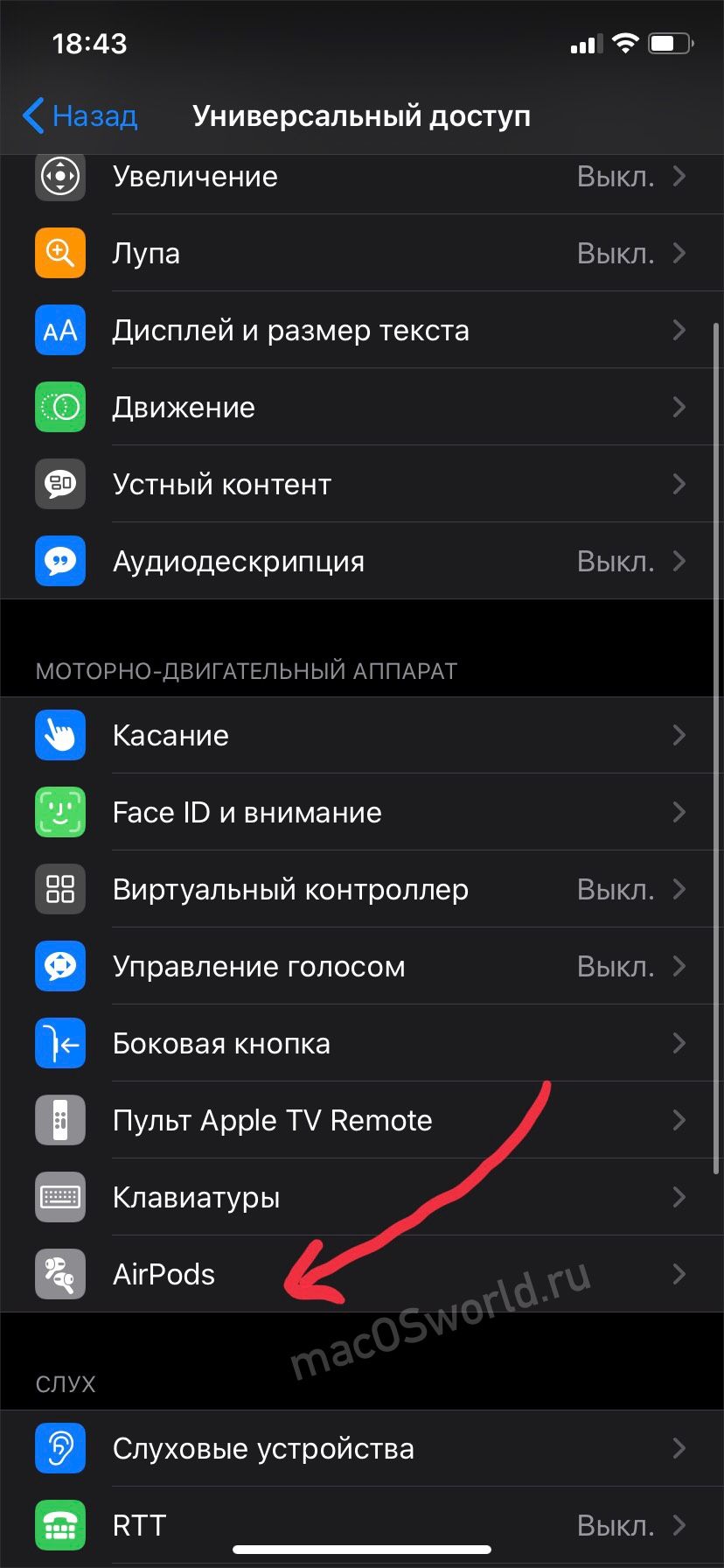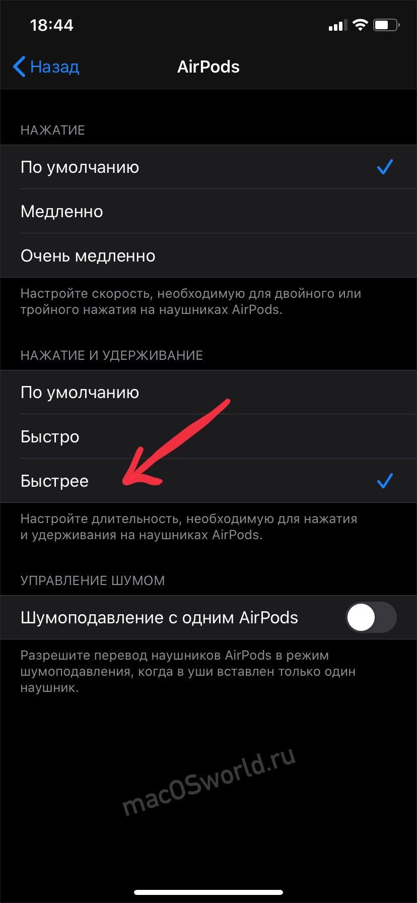 В реальной жизни оказалось, что включить «Прозрачность» проще и быстрее, чем снимать и одевать наушники каждый раз, когда надо что-то послушать или с кем-то поговорить. Для включения режима нужно нажать и подержать секунду «хвостик» одного из наушников. Либо же переключиться через управление громкости в iPhone. Кстати, время удерживания «хвостика» можно настроить в разделе Универсальный достуAirPods. Я установил задержку на минимум.