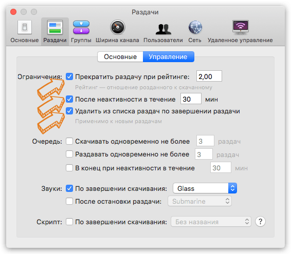 Настроить очистку можно во вкладке Раздачи ▸ Управление, отметив пункт Удалять из списка по завершению раздачи. Для удаления могут служить два тригера: