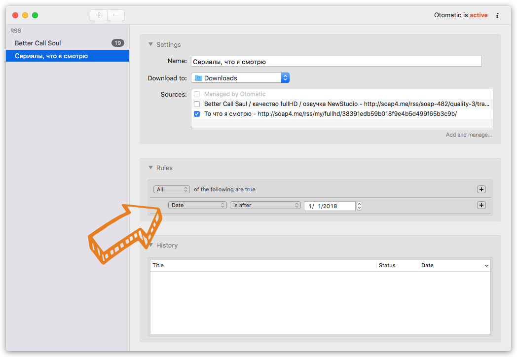 В результате я получил следующее: Otomatic постоянно мониторит RSS с новыми сериалами и сохраняет их торрент-файлы в папку Загрузки, а затем Folx автоматически загружает уже сами файлы. Самое прекрасное, что процесс происходит в фоне и без моего участия. Новые фильмы просто появляются в соответствующей папке Фильмы. Наконец-то!