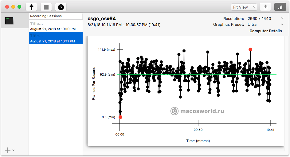 Count It также ведет лог FPS для каждой сессии, по которому удобно смотреть минимальные просадки. Например, вот запись моей игры в CS:GO на максимальных настройках в 2K. Видно, что переодически FPS падает до 40 кадров, хотя средний находится на уровне 93-х.