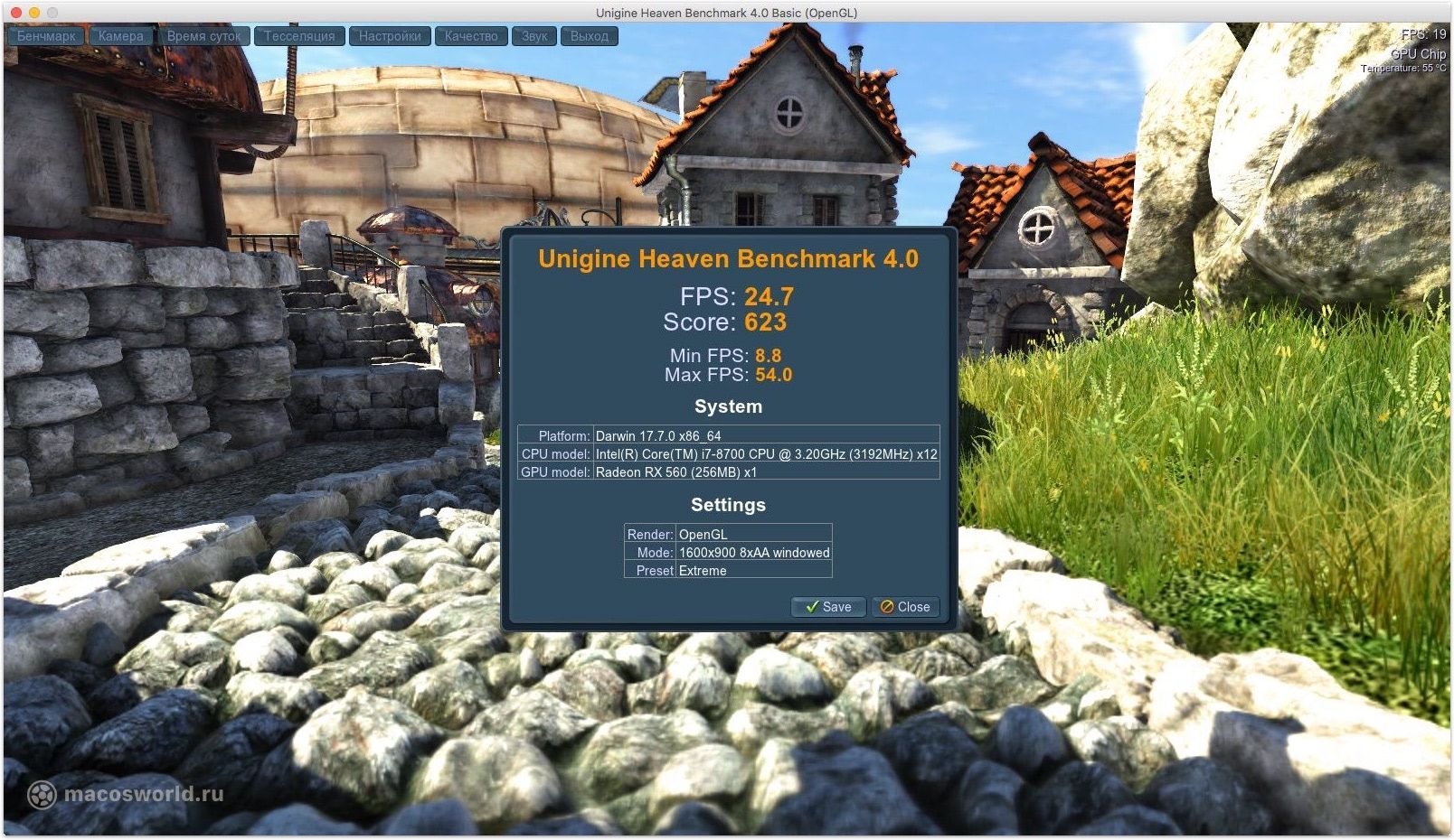 Два теста графической подсистемы, которые не просто делают расчеты, а уже показывают какую-то визуализацию, а-ля игру. Бенчмарки относительно старенькие: 2009 и 2013 год. Но все еще пользуются популярностью ввиду отсутствия альтернатив под macOS.