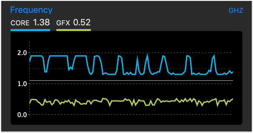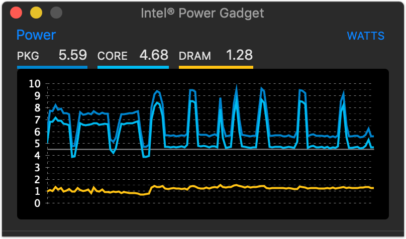Если ваш компьютер перегревается и начинает понижать частоту процессора, вы это увидите через Intel Power Gadget. Если же все хорошо, то линии будут практически прямыми.