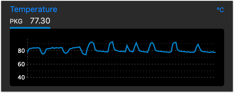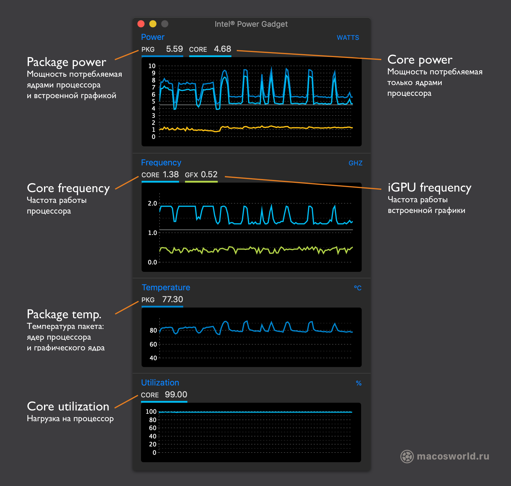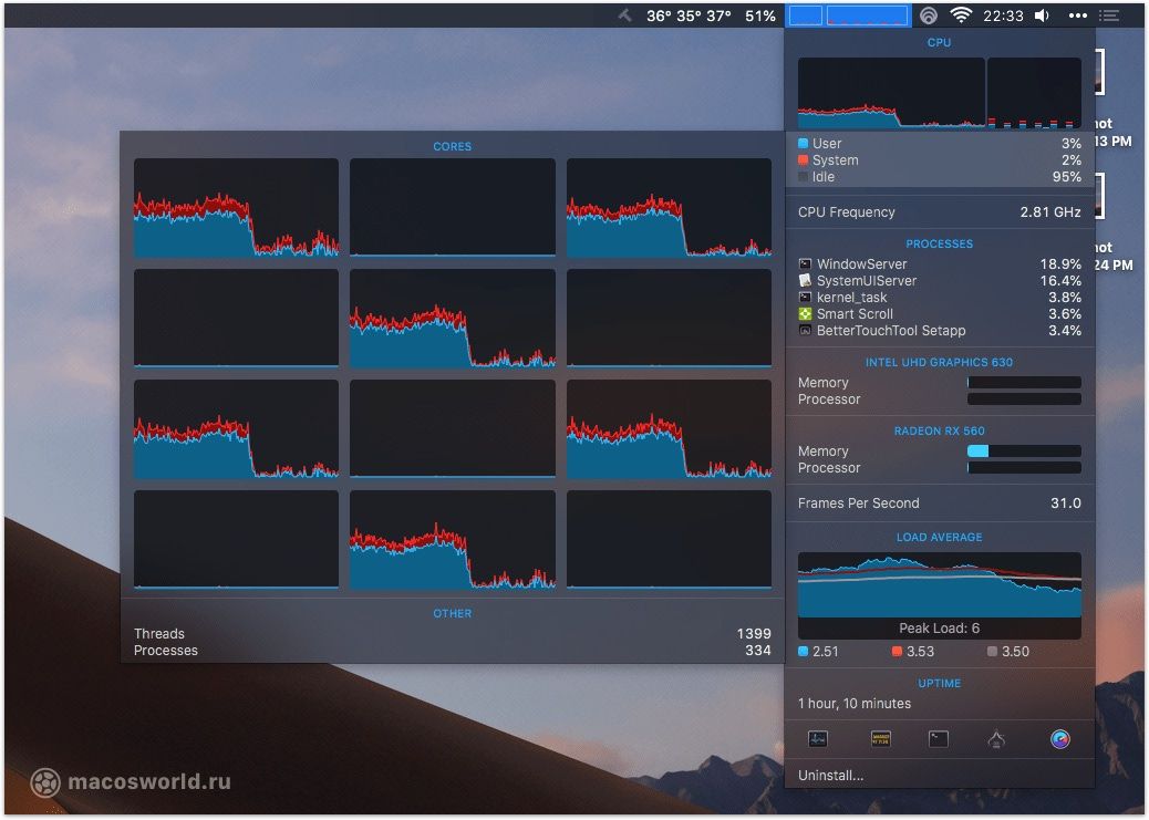 iStat Menus показывает расширенную статистику по всем доступным датчикам компьютера. В нем можно посмотреть напряжение на процессор, температуру GPU и нагрузку на процессор по потокам и температуру по ядрам, скорость вращения вентиляторов. Вообщем все, что душе угодно. Хорошо дополняет Intel Power Gadget.
