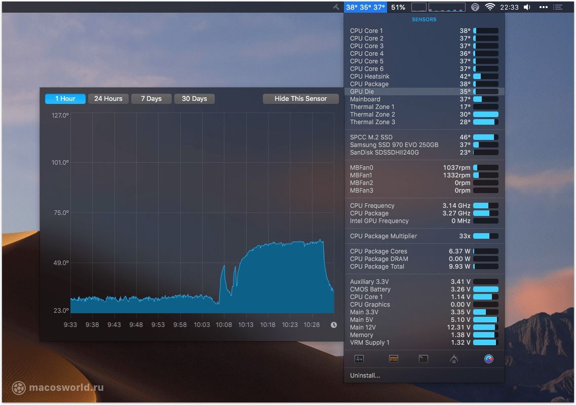 iStat Menus единственная платная программа из всех представленных. Пожалуй единственный её минус — невозможность записывать показатели датчиков в лог. Но при этом она «помнит» все показатели за час, день, неделю и месяц. Однозначно стоит своих денег.
