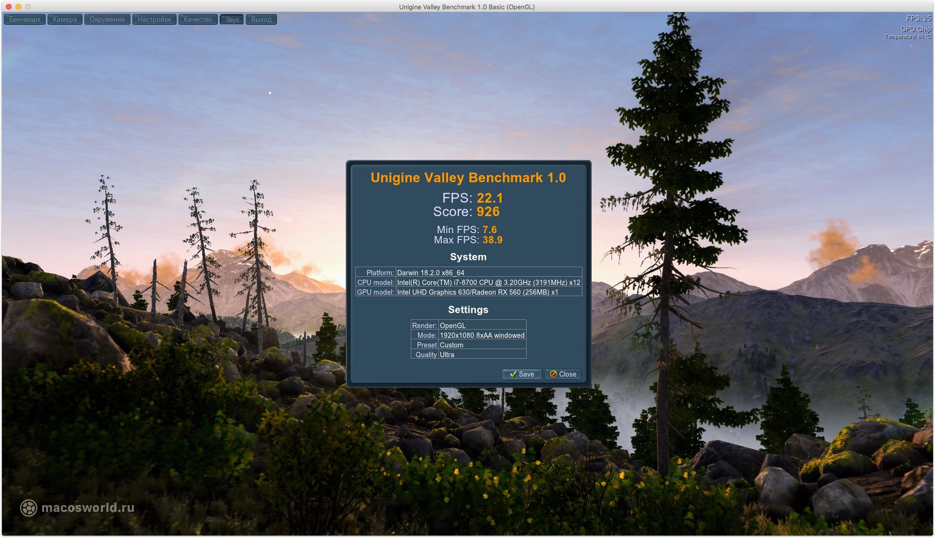 Бенчмарк занимает несколько минут и по итогам выдаст вам средний FPS из количества набранных баллов. В Vallay, разрешении FullHD и максимальных настройках моя RX560 показала 912 балла и 21.8 FPS. В Haven — 623 балла, 24.7 FPS.