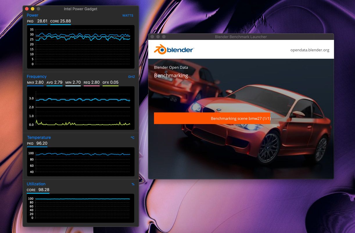 Во время тестов нужно мониторить состояние всех компонентов. Поэтому сначала я расскажу про три утилиты мониторинга: Intel Power Gadget, iStat Menus и TG Pro. А затем уже про свои любимые тестовые пакеты: Geekbench, Blender, Cinabench, Prime95, Haven, Vallay и Disk Speed Test.
