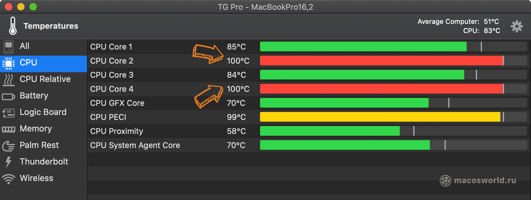 Утилита TG Pro визуализирует показатели внутренних сенсоров. Если вам нужно мониторить разные температуры, то на данный момент TG Pro — лучшее решение. Программа поможет определить, есть ли у процессора температурный разброс по ядрам, а значит — насколько хорошо нанесена термопаста между кристалом процессора и радиатором охлаждения.