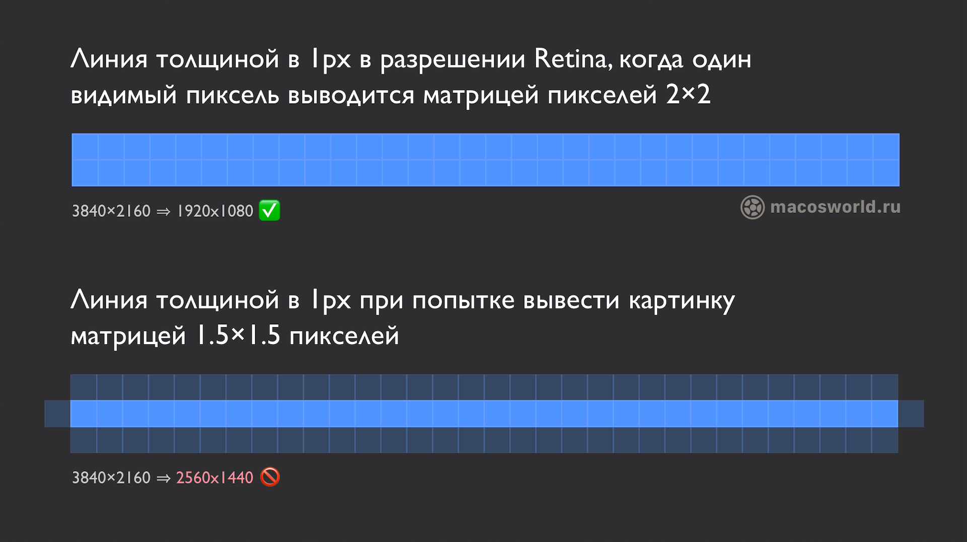 ΠΡΠ»ΠΈ ΠΆΠ΅ ΠΏΠΎΠΏΡΡΠ°ΡΡΡΡ ΠΌΠ°ΡΡΡΠ°Π±ΠΈΡΠΎΠ²Π°ΡΡ ΡΠ°Π·ΡΠ΅ΡΠ΅Π½ΠΈΠ΅ 3840Γ2160 Π΄ΠΎ ΡΠΎΠ²ΠΌΠ΅ΡΡΠΈΠΌΠΎΠ³ΠΎ Ρ Retina, ΡΠΎ Π΅Π³ΠΎ Π½Π°Π΄ΠΎ Π±ΡΠ΄Π΅Ρ ΡΠΌΠ΅Π½ΡΡΠΈΡΡ ΠΏΠΎ Π³ΠΎΡΠΈΠ·ΠΎΠ½ΡΠ°Π»ΠΈ ΠΈ Π²Π΅ΡΡΠΈΠΊΠ°Π»ΠΈ Π² Π΄Π²Π° ΡΠ°Π·Π°. Π’Π°ΠΊΠΈΠΌ ΠΎΠ±ΡΠ°Π·ΠΎΠΌ, ΠΊΠ°ΠΆΠ΄ΡΠΉ ΠΏΠΈΠΊΡΠ΅Π»Ρ Π±ΡΠ΄Π΅Ρ ΡΠΎΡΡΠΎΡΡΡ ΠΈΠ· ΡΠ΅ΡΡΡΡΡ ΡΠΈΠ·ΠΈΡΠ΅ΡΠΊΠΈΡ , Π° Π²ΠΈΠ΄ΠΈΠΌΠΎΠ΅ ΡΠ°Π·ΡΠ΅ΡΠ΅Π½ΠΈΠ΅ ΡΠΎΡΡΠ°Π²ΠΈΡ 1920Γ1080 ΠΏΠΈΠΊΡΠ΅Π»Π΅ΠΉ.