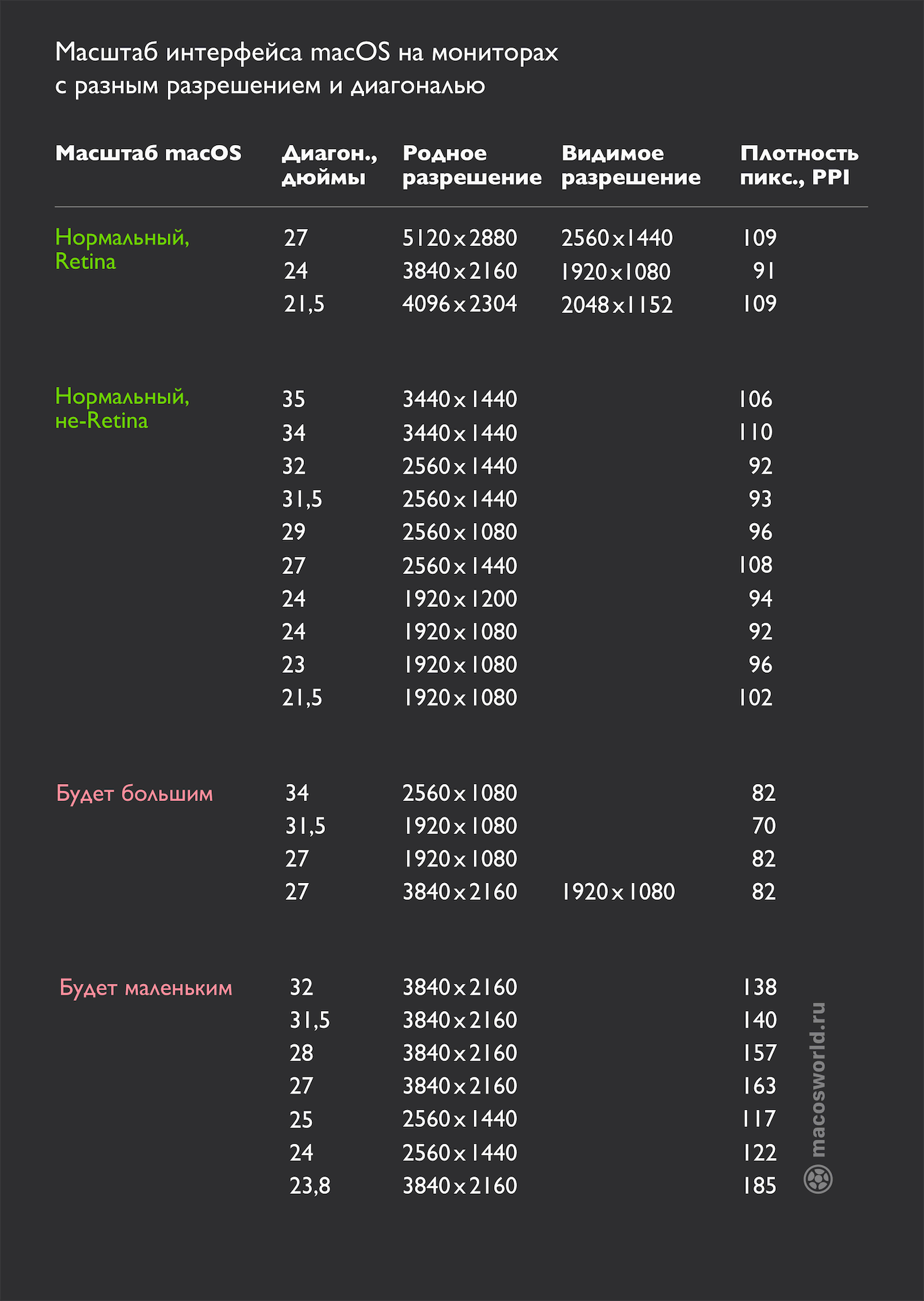 ΠΠΎΠ΄Π°Π²Π»ΡΡΡΠ΅Π΅ Π±ΠΎΠ»ΡΡΠΈΠ½ΡΡΠ²ΠΎ 27-Π΄ΡΠΉΠΌΠΎΠ²ΡΡ 4Π-ΠΌΠΎΠ½ΠΈΡΠΎΡΠΎΠ² ΠΈΠΌΠ΅ΡΡ ΡΠ°Π·ΡΠ΅ΡΠ΅Π½ΠΈΠ΅ 3840Γ2160 ΠΏΠΈΠΊΡΠ΅Π»Π΅ΠΉ. ΠΡΠ»ΠΈ Π²ΡΠ²ΠΎΠ΄ΠΈΡΡ ΠΊΠ°ΡΡΠΈΠ½ΠΊΡ Π² ΡΠ°ΠΊΠΎΠΌ ΡΠ°Π·ΡΠ΅ΡΠ΅Π½ΠΈΠΈ, ΡΠΎ ΠΈΠ½ΡΠ΅ΡΡΠ΅ΠΉΡ macOS Π±ΡΠ΄Π΅Ρ ΠΌΠ΅Π»ΠΊΠΈΠΌ. Π’Π°ΠΊ ΠΊΠ°ΠΊ ΠΏΠ»ΠΎΡΠ½ΠΎΡΡΡ ΠΏΠΈΠΊΡΠ΅Π»Π΅ΠΉ (PPI) Π±ΡΠ΄Π΅Ρ ΡΠ°Π²Π½Π° 163.