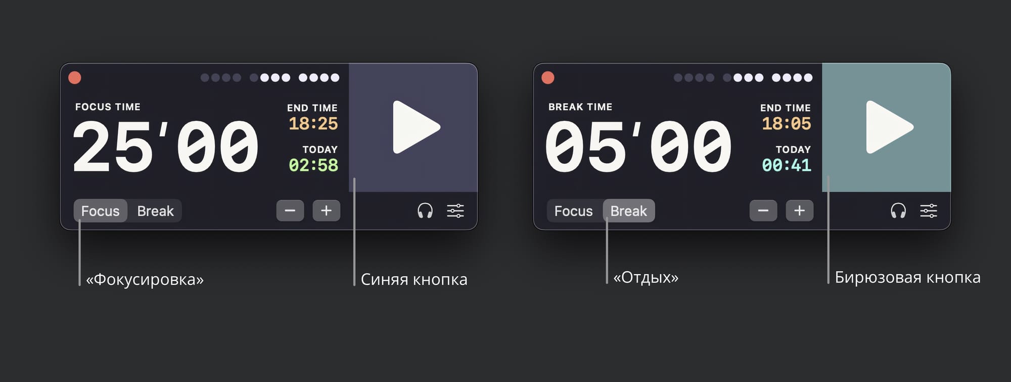 О том, в каком режиме находится таймер, можно понять по подсказкам, состоянию соответствующего переключателя и цвету кнопки Start. Лично я ориентируюсь по цвету: в режиме фокусировки кнопка сиреневая, в режиме отдыха — берюзовая. Буквально за день-два к цветам привыкаешь и перепутать таймер уже невозможно.