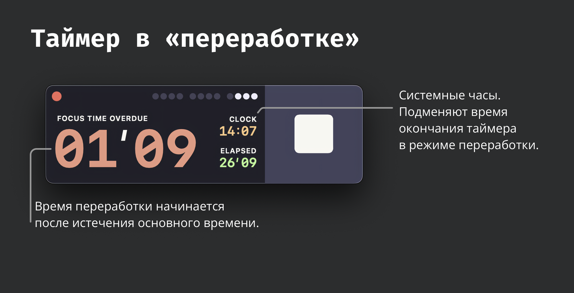 Также в интерфейсе я разместил небольшие часы, которые показывают, когда закончится текущей сессии. Эти мини-часы дают лучшее ощущение времени, а также помогают сразу отвечать на вопросы типа "когда ты освободишься?".