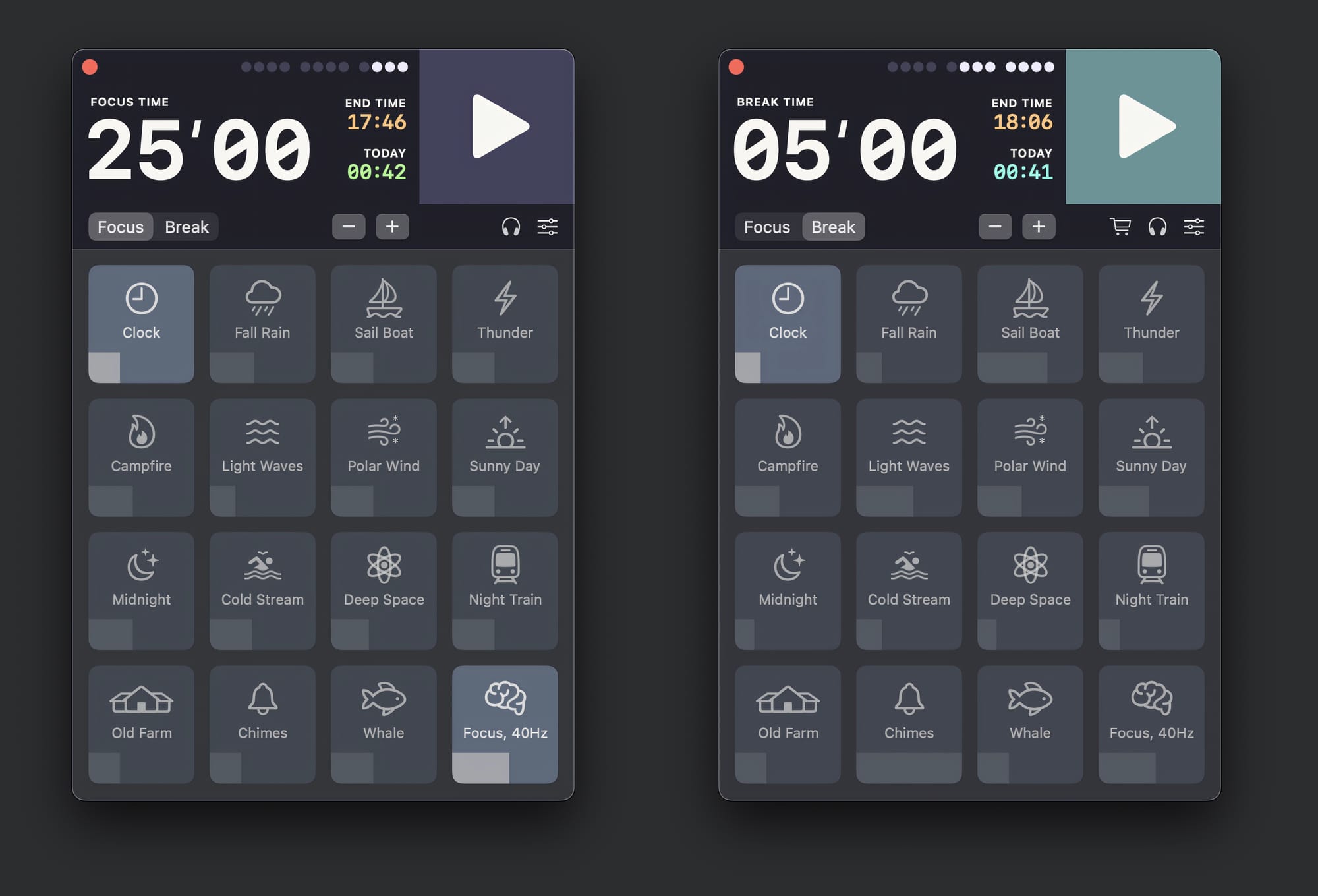 Focusito имеет 15 различных фоновых звуков и один бинауральный ритм