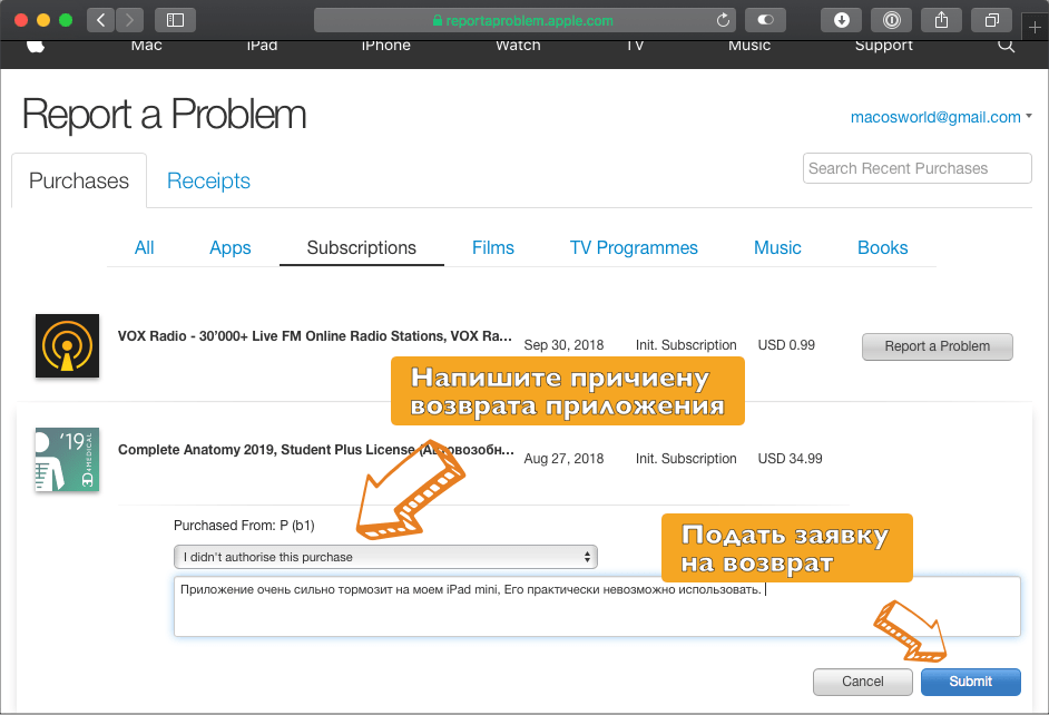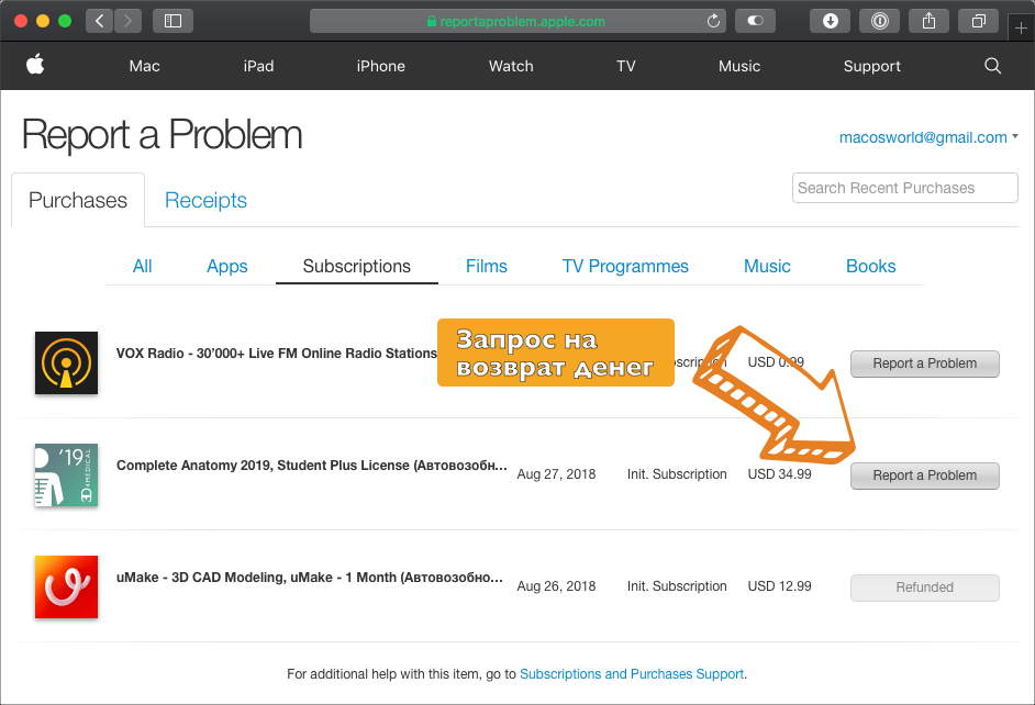 - Зайдите на сайт reportaproblem.apple.com со своим Apple ID;