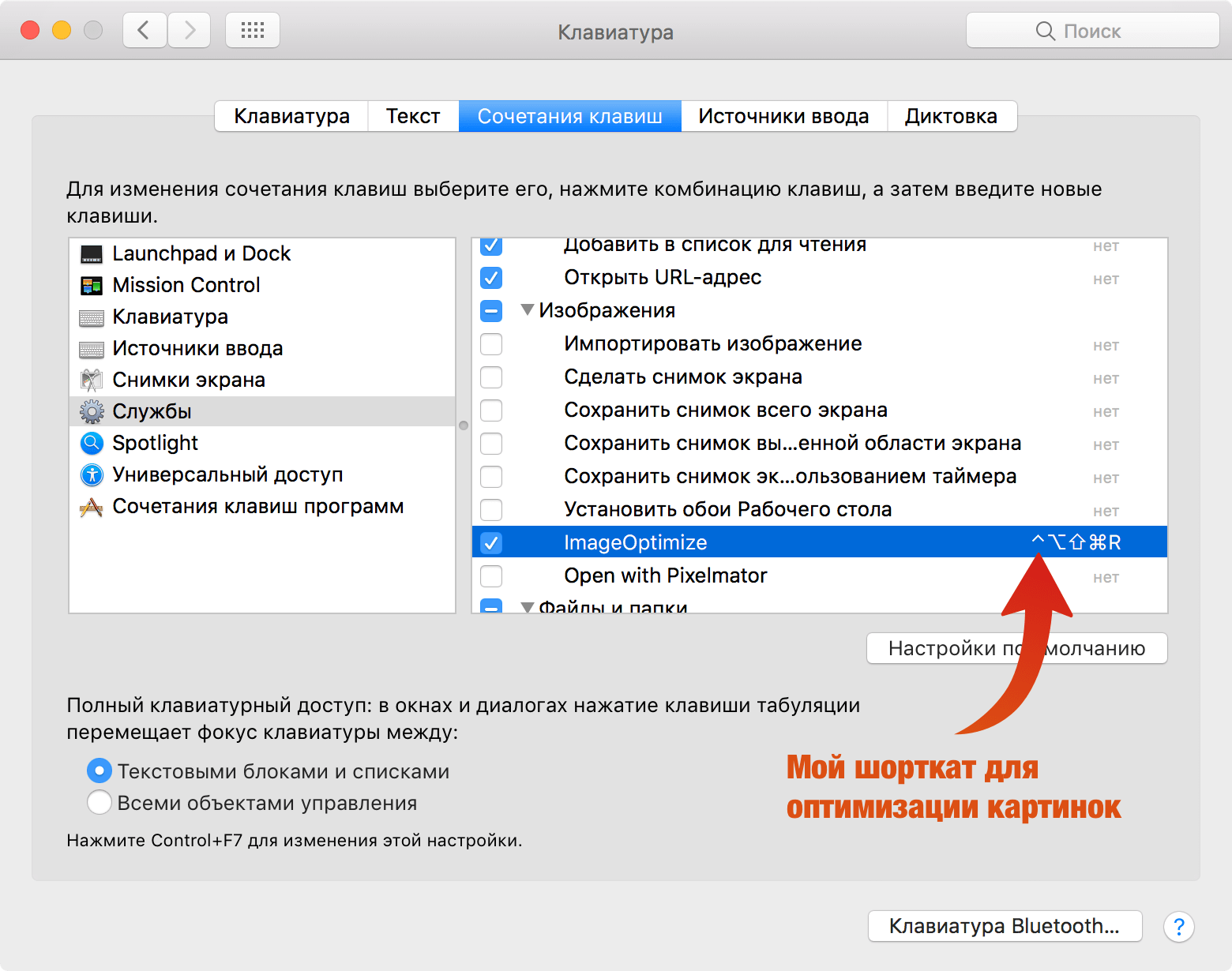 Стандартные клавиатурные сочетания macOS вы найдёте в Настройках ▸ Клавиатура ▸ Сочетания клавиш. Там настраиваются шорткаты на системные функции: переключение языка, скриншоты, запуск служб и т.п.