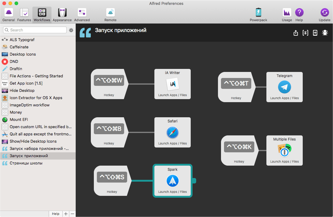 Шорткаты для запуска программ я задаю через Alfred. Через него же запускаю скрипты, вроде конвертации Markdown в HTML.
