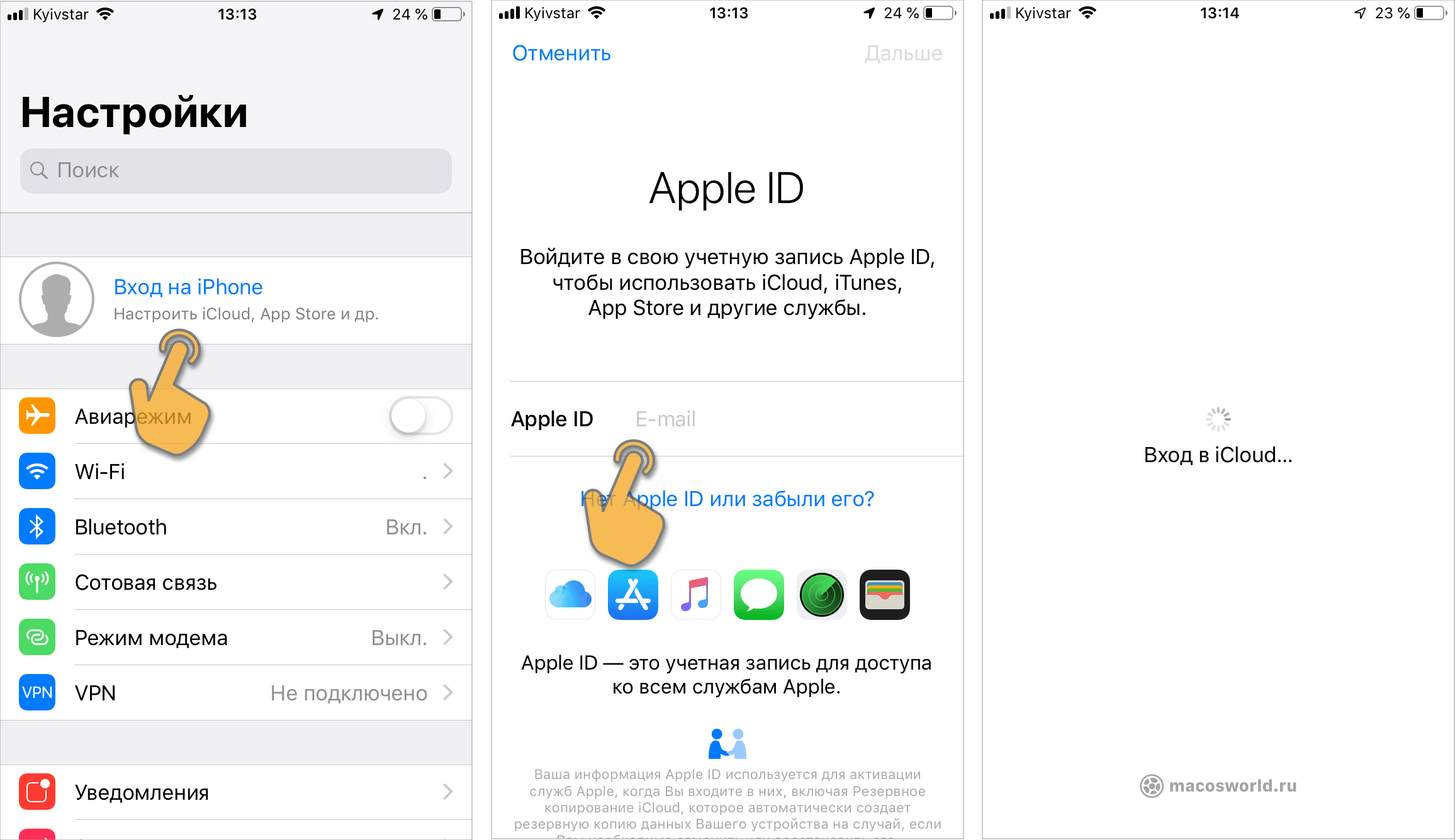 Вход в iCloud можно выполнить непосредственно на устройстве Apple. Для этого введите свой Apple ID в: