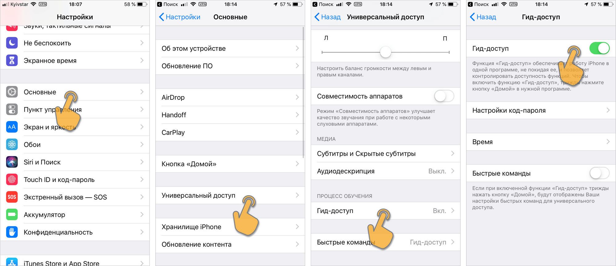 iPhone или iPad просто перестанет реагировать на нажатия любых аппаратных кнопок и на жесты. Предварительно включить его можно в Настройках ▸ Основные ▸ Универсальный доступ ▸ Гид-доступ.