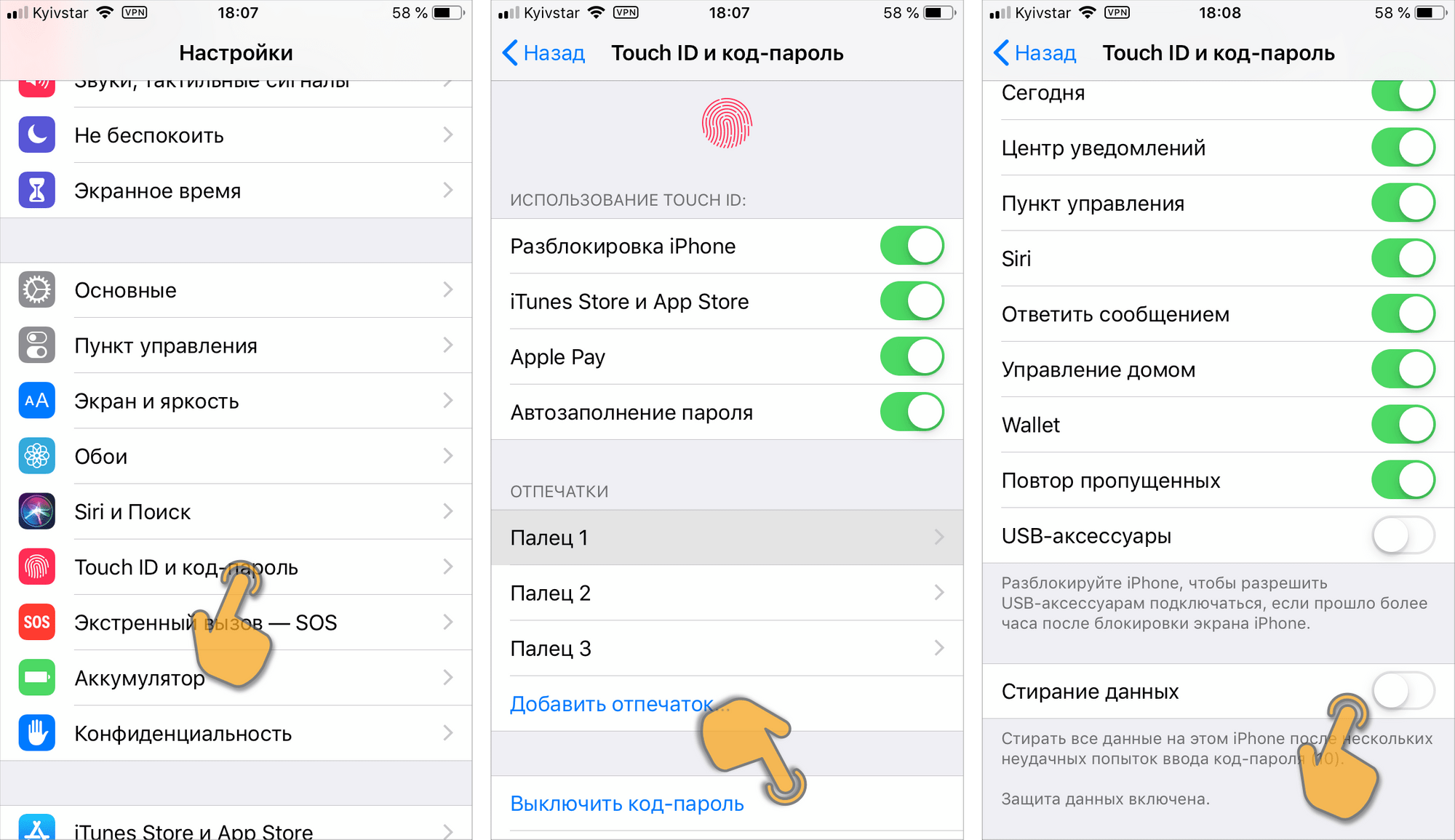 Обязательно убедитесь в том, что отключена функция «Стереть данные». Если этого не сделать, то iPhone или iPad самоочистится в случае 10 неправильных попыток ввода. Как показывает практика, упорные дети добираются до этого значения очень быстро.