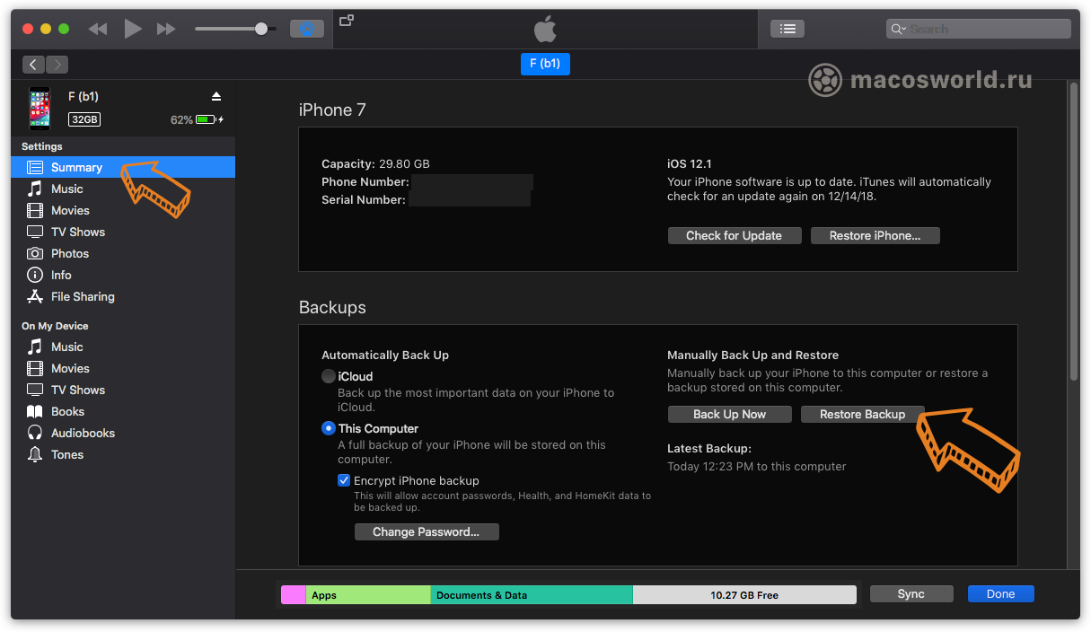 👉 iTunes▸iPhone▸Общее▸Восстановить из резервной копии