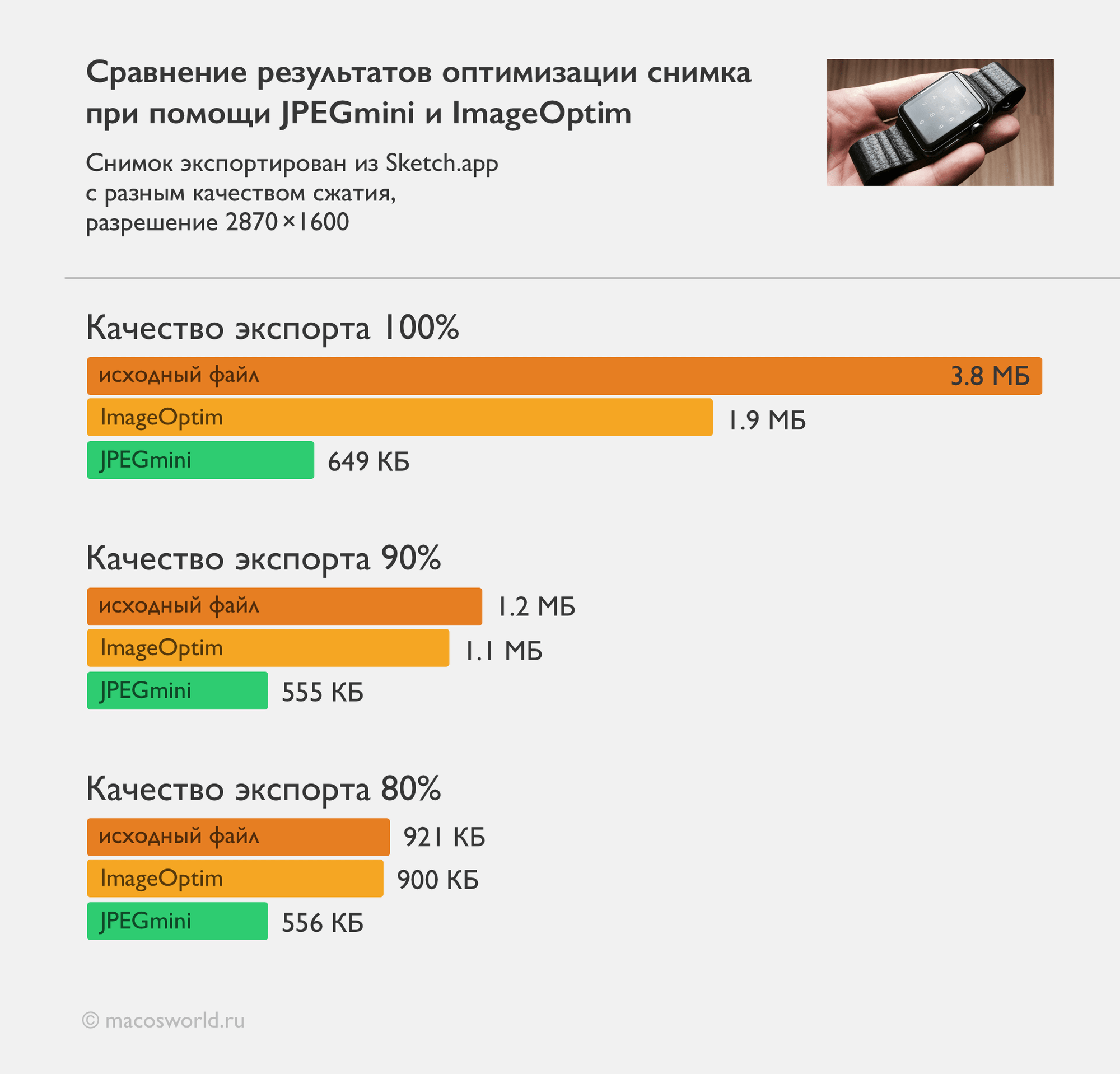Покажу на примере заглавной картинки разрешением 2870 ×1600 пикселей из обзора ремешков для Apple Watch. Я экспортировал ее из Sketch в трех разных качествах, а затем дополнительно оптимизировал оригиналы при помощи JPEGmini и ImageOptim (модули JPEGOptim и Jpegtran).