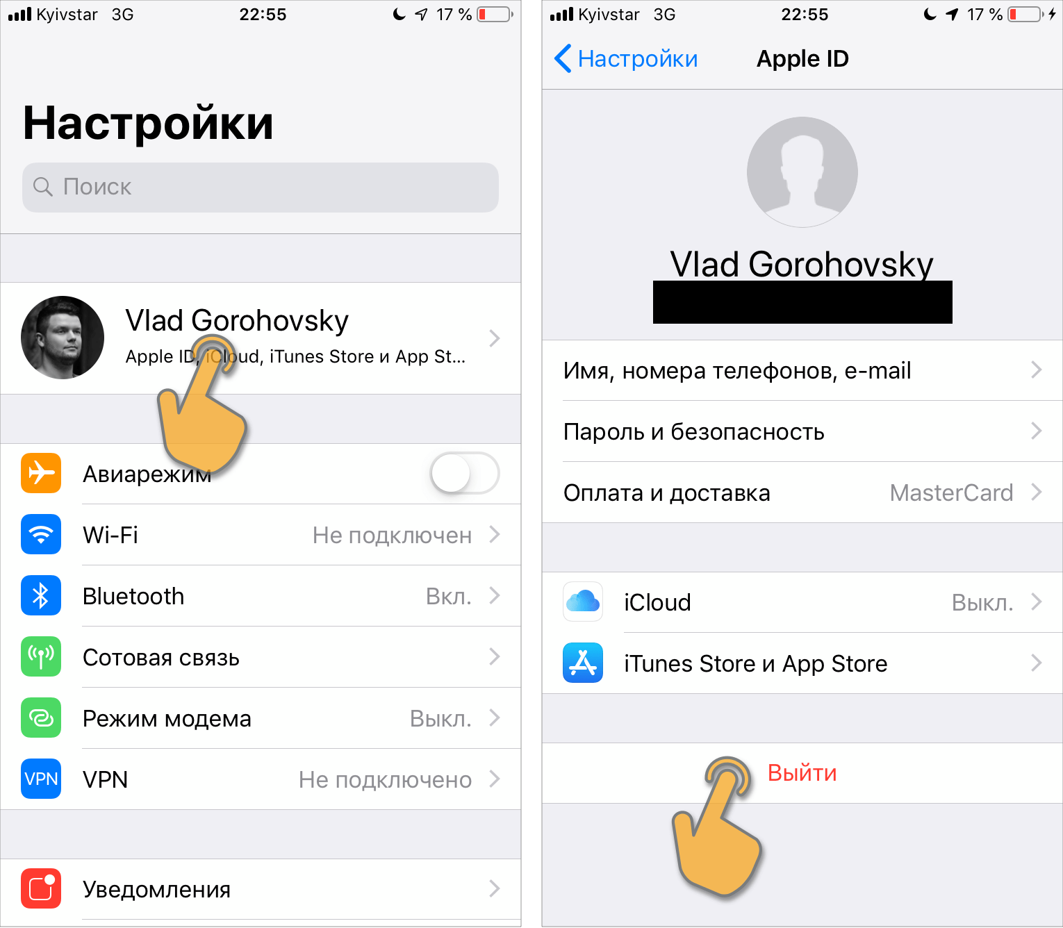 Чтобы отвязать от Apple ID свой iPhone зайдите в Настройки → Ваше имя и нажмите «Выйти» в самом низу страницы.