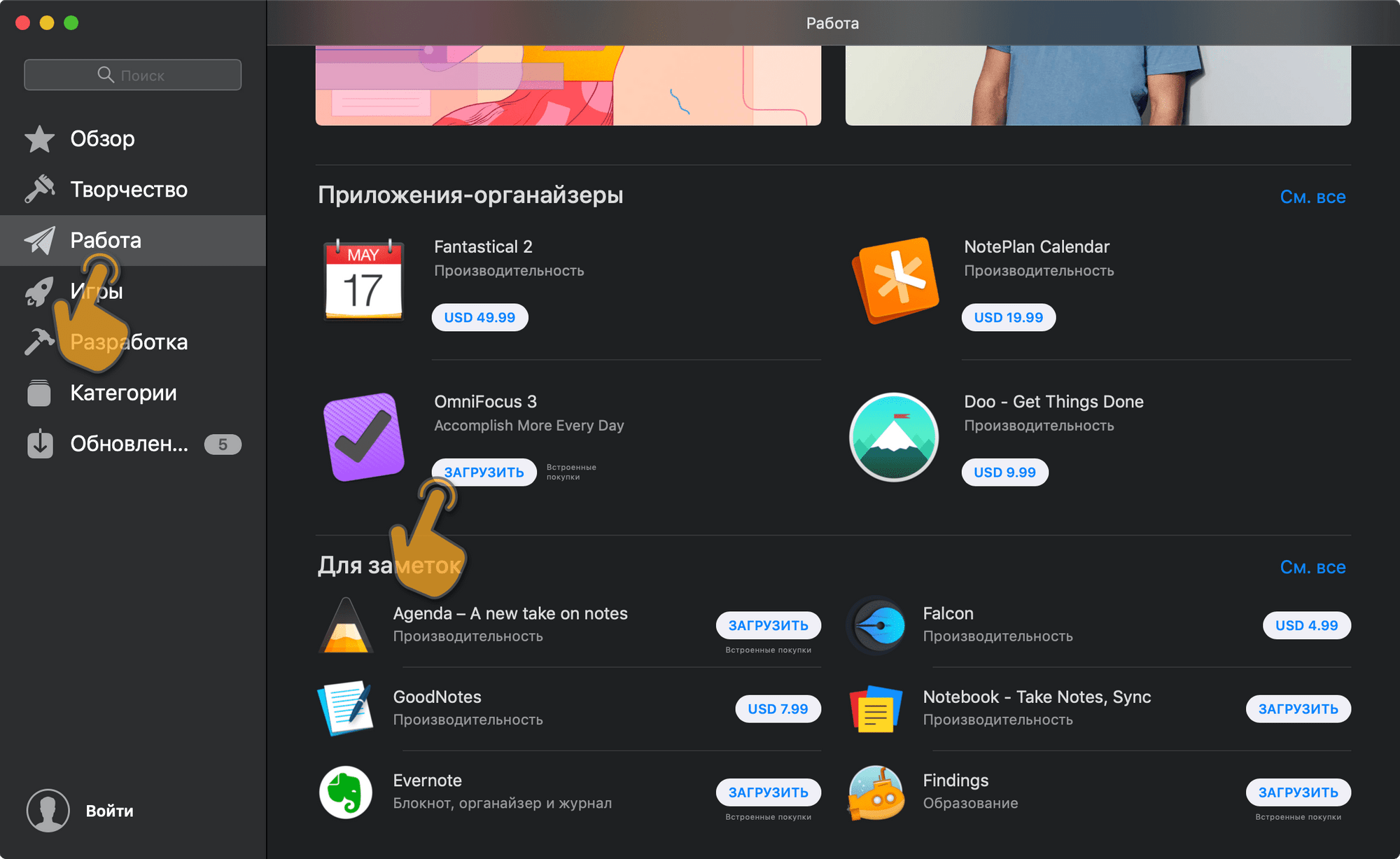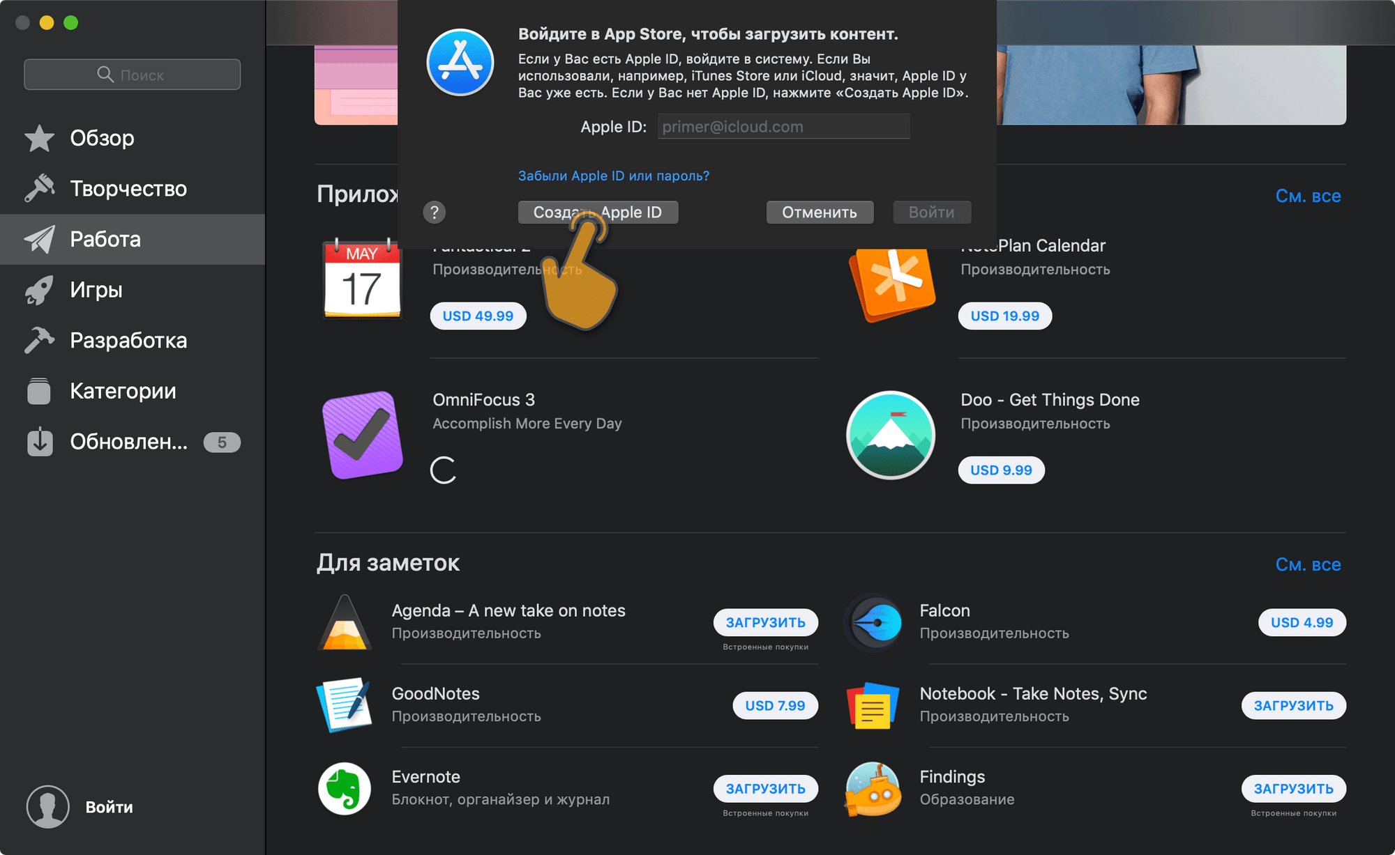 - Перейдите в раздел Творчество и выберете любое бесплатное приложение. Возле такого приложения всегда есть кнопка «Загрузить», а затем — «Создать Apple ID»;