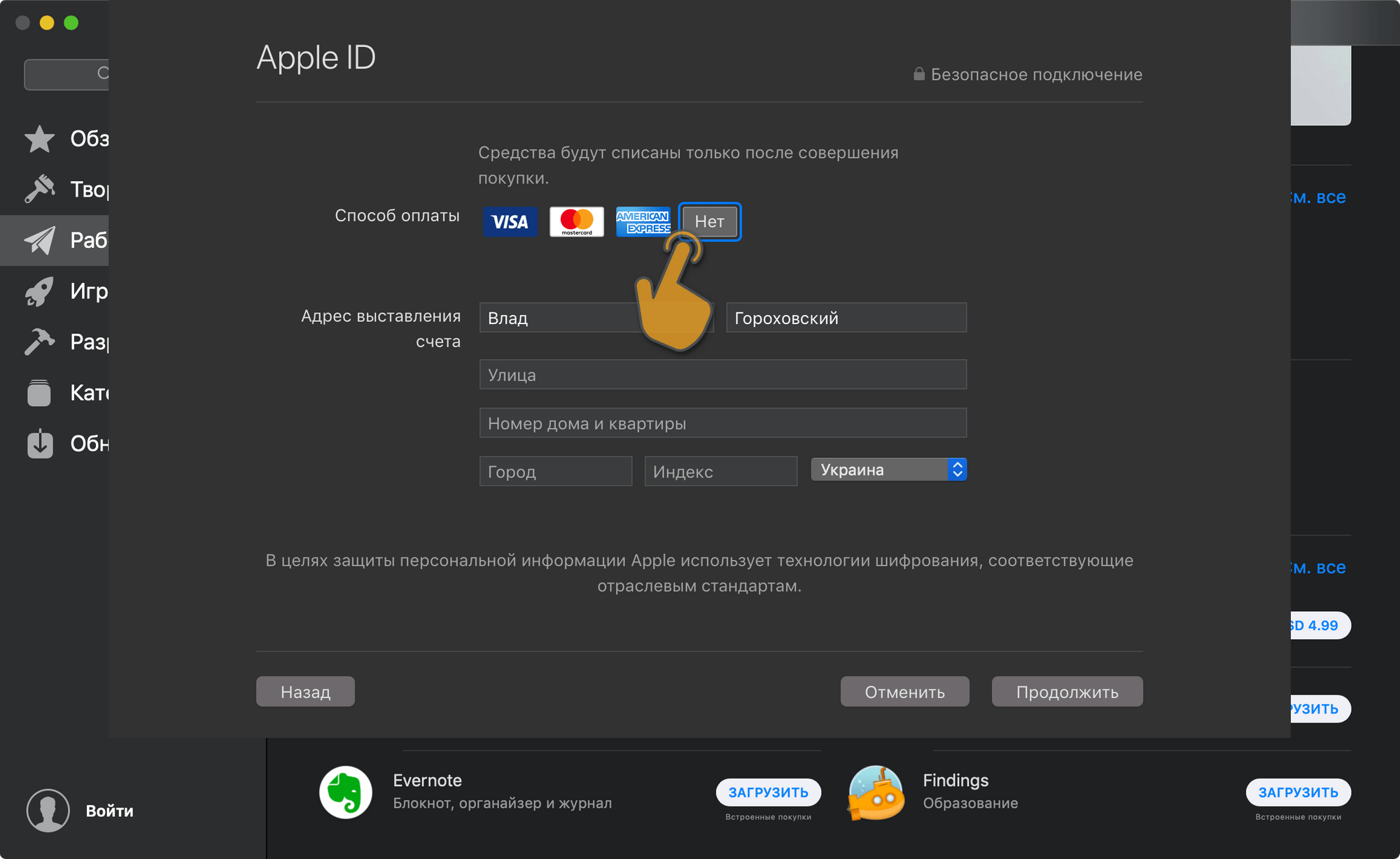 На финальных этапах регистрации Apple ID вас попросят указать реквизиты банковской карты. Такая карта есть не у всех, но без нее регистрации не завершить.