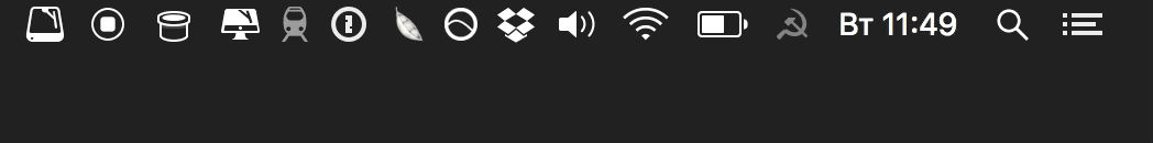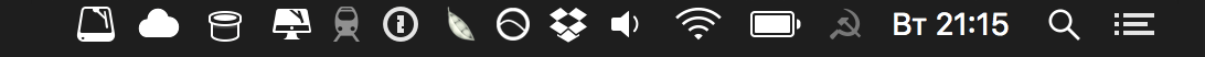 Если кто не знает, это та штука, где находятся часы, индикаторы заряда батареи и WiFi. И каждая вторая программа пытается поместить туда свою иконку. Хорошо подумайте над тем, нужны ли вам вообще иконки конкретных приложений в Menubar. Если их вовремя не спрятать, то рано или поздно Menubar начнёт мигать всеми цветами радуги.