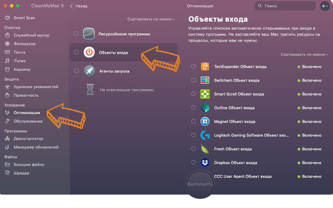 И раз уж мы открыли CleanMyMac, то загляните в Ускорение ▸ Оптимизация ▸ Объекты входа и удалите все приложения, которые не нужны в автозагрузке.