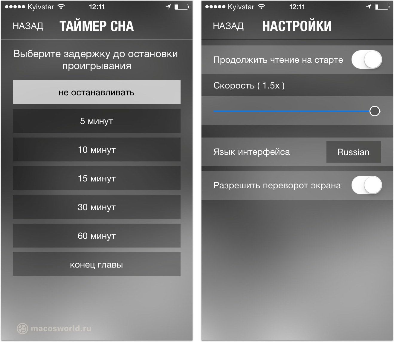 Любителям слушать аудиокниги для iPhone перед сном понравится таймер «засыпания». Настроить мы можем скорость проигрывания, разрешение на переворот экрана, разрешение на автопроигрывание при запуске приложения и язык интерфейса.