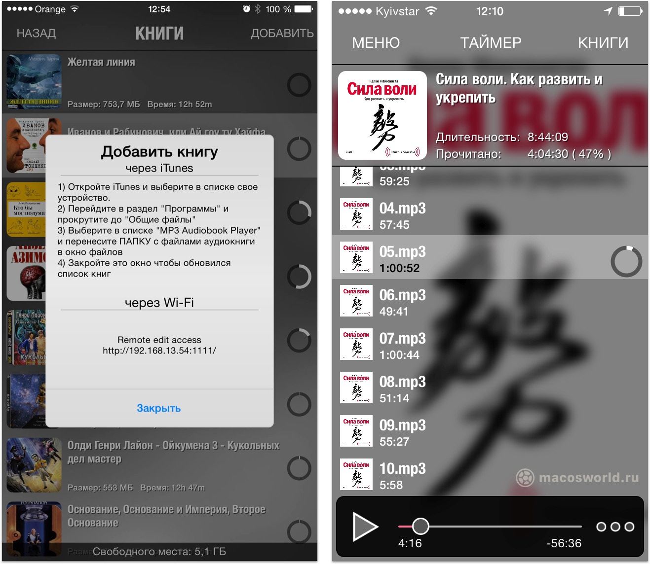 В этом случае все просто: через iTunes забрасываем нужные файлы (mp3, m4a, m4b) в приложение MP3 Audiobook Player и слушаем. Всё! При первом запуске появляется подробное окно с инструкцией для добавления книг через iTunes или Wi-Fi, так что разобраться сможет любой.