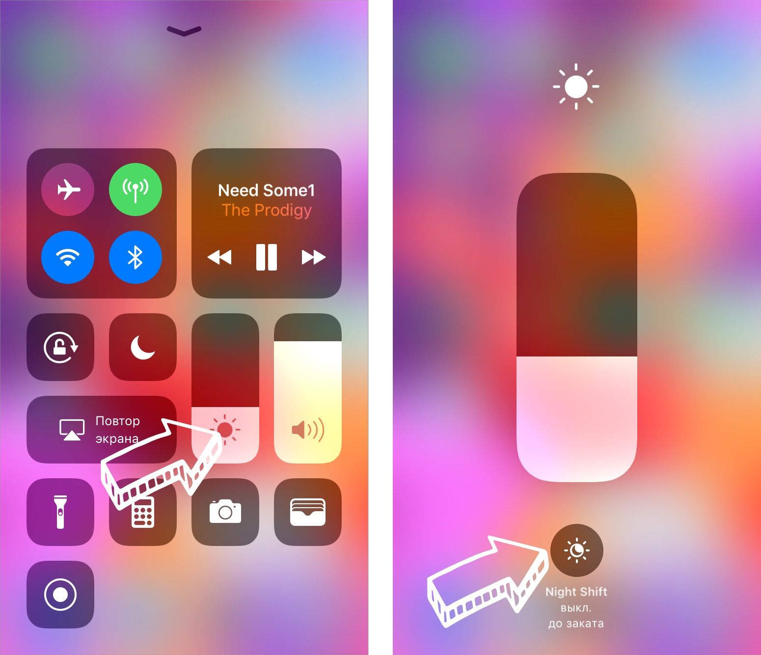 Night Shift всегда можно активировать вручную прямо с главного экрана, свайпом вверх. После этого Night Shift будет работать до ближайшего рассвета, а затем выключится.