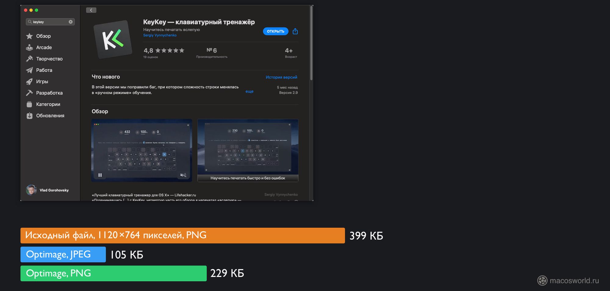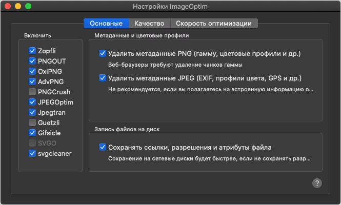 Что касается размера сжатых файлов, то они либо такие же как у моего «настроенного» ImageOptim, либо чуть-чуть больше. Это я могу сказать по тем тестам, которые делал еще год назад, в момент перехода на Optimage.