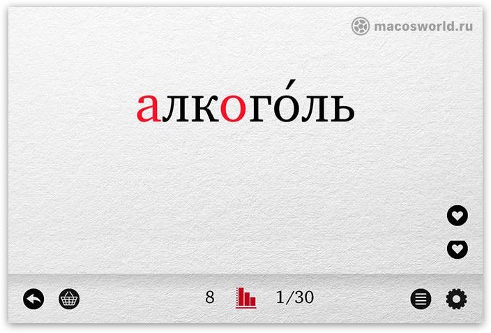 В Ударнике также собраны карточки со 120-ю словами. Ваша задача — выбрать правильную ударную гласную в приведённых словах. Если вы правы, то над ней появится знак ударения. В противном случае ошибочная гласная станет красной.