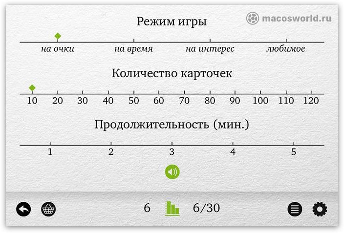 Есть несколько типов игры: на время, на очки, на интерес, а также игра с любимыми словами. Для каждой игры можно задать нужное количество карточек (от 10 до 120).