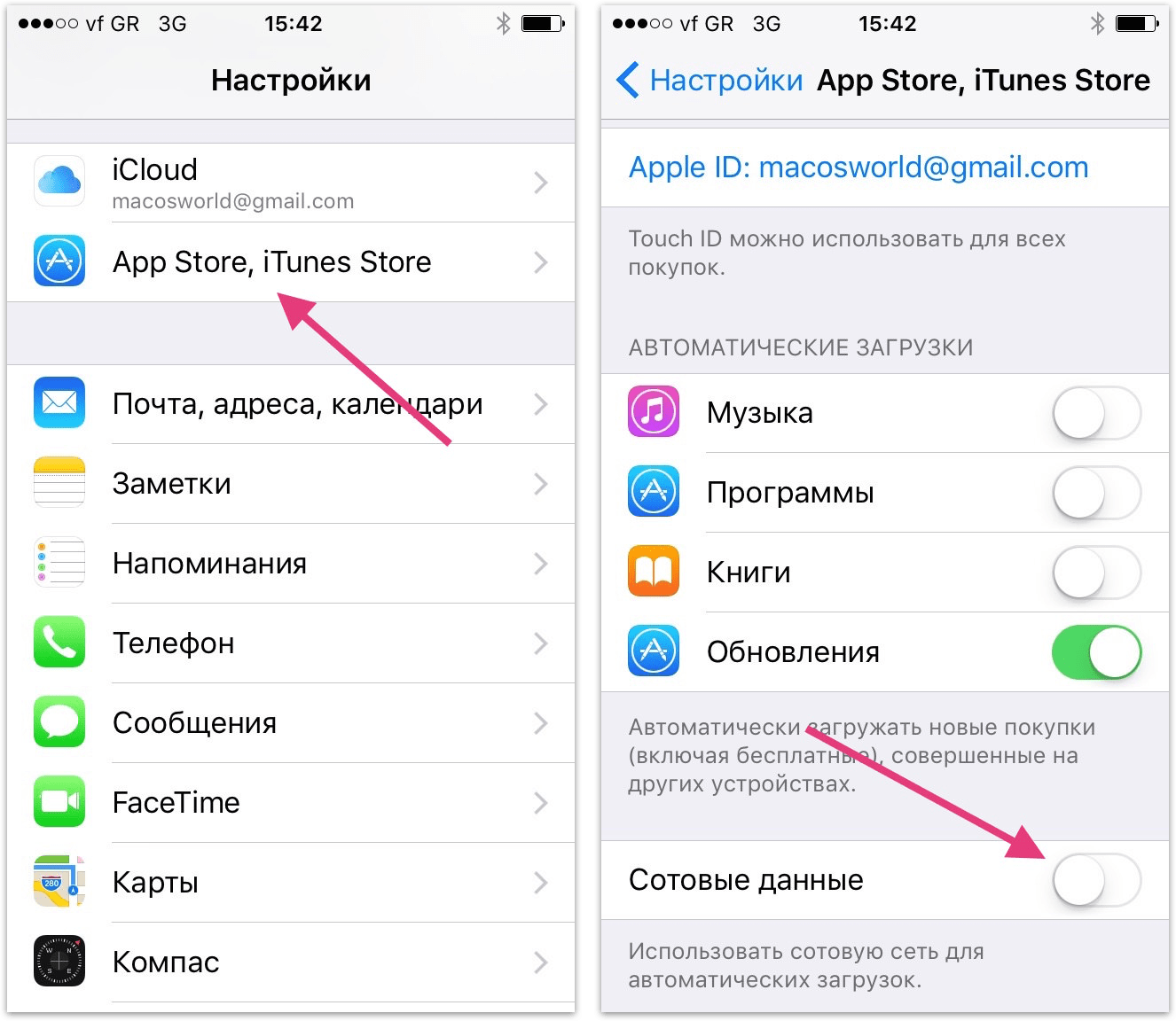 App Store, iTunes Store ▸ Сотовые данные. Здесь выключите автоматическую загрузку обновлений программ через сотовую сеть. Чем больше у вас программ, тем больше трафика это сэкономит.