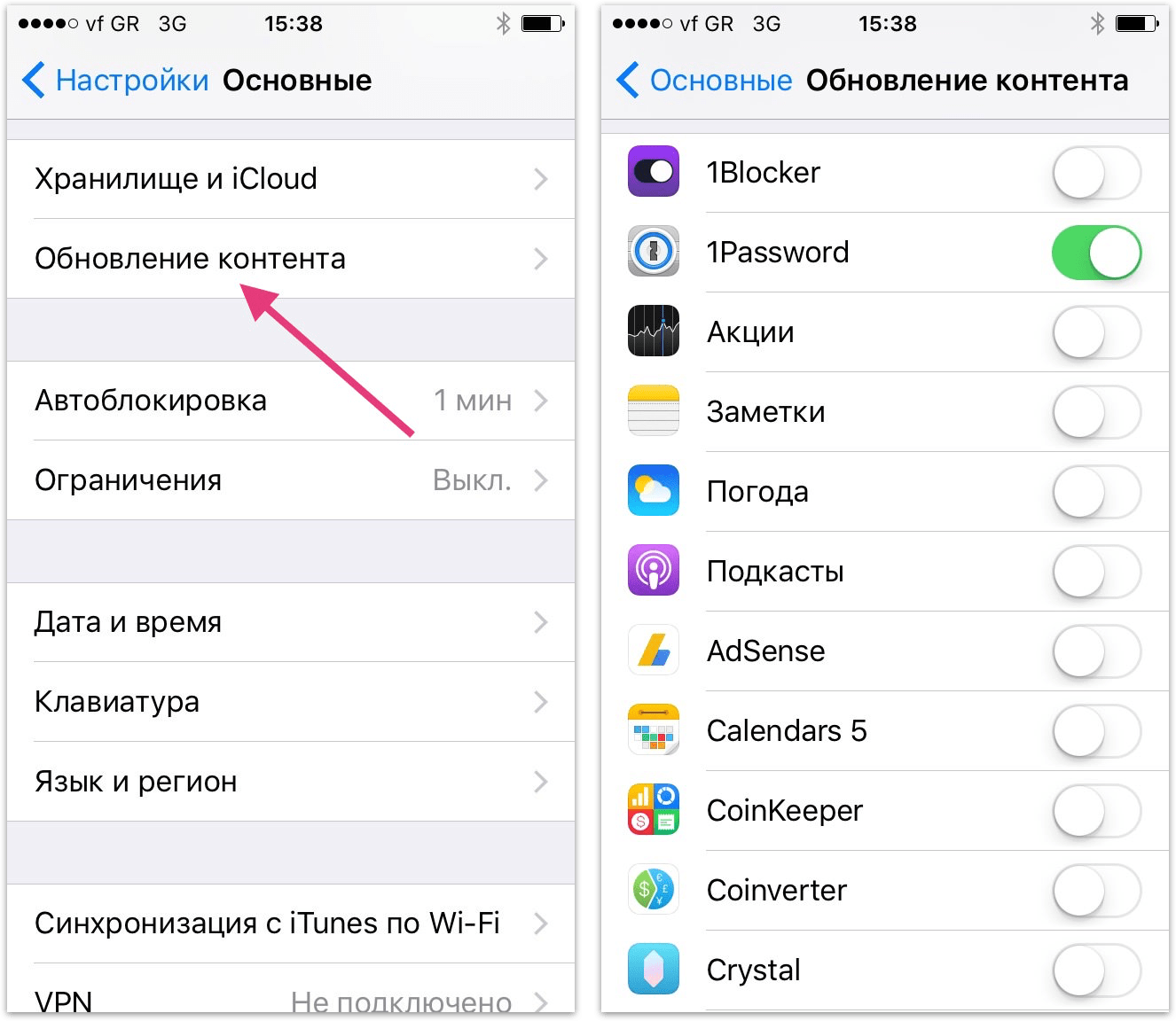 Основные ▸ Обновление контента. Тут расположен список программ, которые обновляют содержимое в фоне. Запретите такие обновление и программы получат право выхода в интернет только будучи запущенными. Никаких неудобств, но трафик экономит.