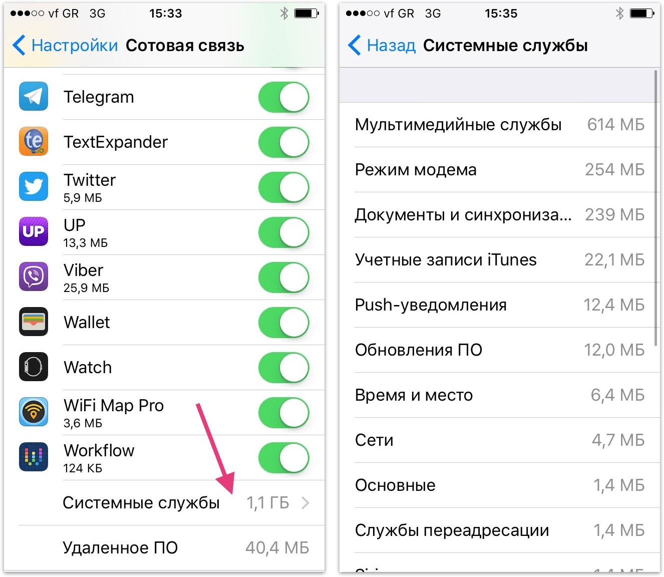 Теперь обратите внимание на меню Системные службы. В моем случае, как раз они и потратили трафика — 1.1 Гб. Увы, закручивание гаек -процесс не очевидный и каждую настройку придется в дебрях меню.