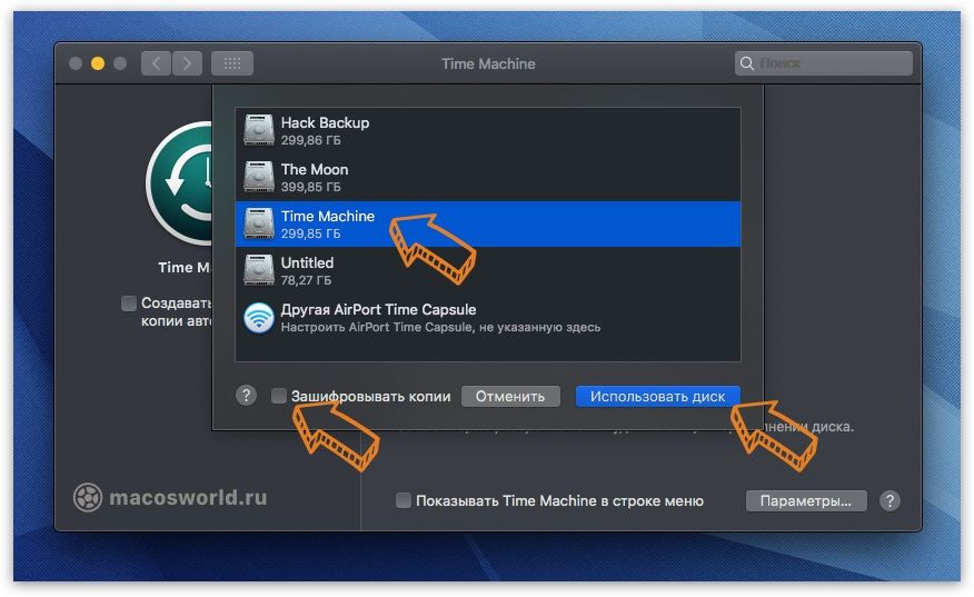 ▸ Cистемные настройки… ▸ Time Machine ▸ Выбрать диск…