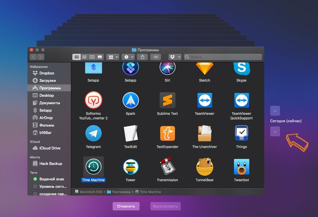Если появилась необходимость восстановить какой-то файл, запустите Time Machine из папки Приложения: